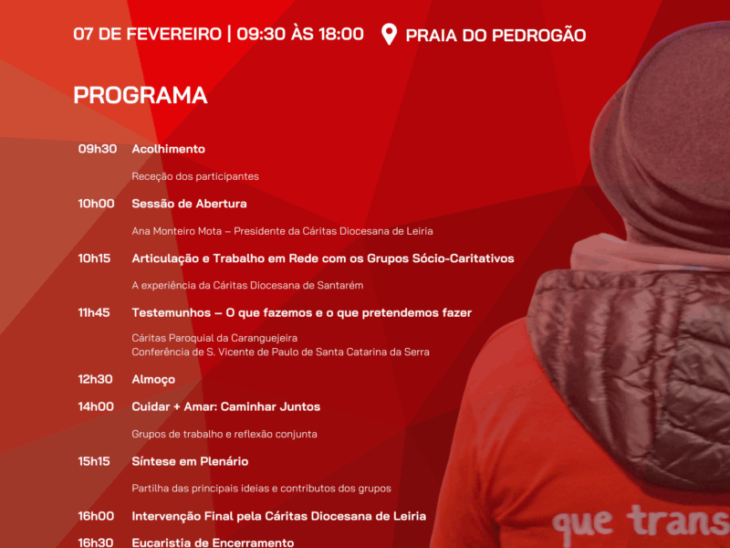 A Cáritas Diocesana de Leiria promove, no próximo dia 7 de fevereiro de 2026 (sábado), o I Encontro dos Grupos Sócio-Caritativos da Diocese de Leiria-Fátima, que terá lugar na Praia do Pedrogão, entre as 09h30 e as 18h00, no âmbito do projeto Cuidar + Amar. Este Encontro surge como um dos eixos prioritários da Cáritas […]